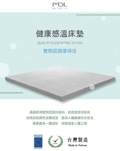 MDL 健康感溫記憶床墊,採用高黏彈性液體成型,能與人體曲線完全密合,並能有效釋壓、吸震,完全支撐脊椎,使睡眠中,脊椎保持s型之自然生理曲線,適合喜歡軟式床墊之各年齡層使用。